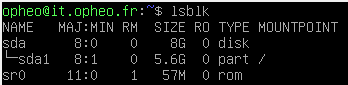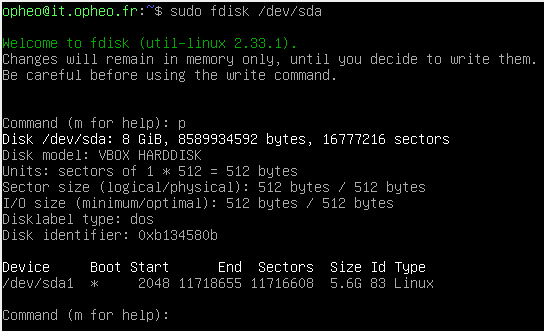 On voit que le disque fait 8G et que seulement 5.6G sont utilisés. Le restant servira de partition LVM de test.