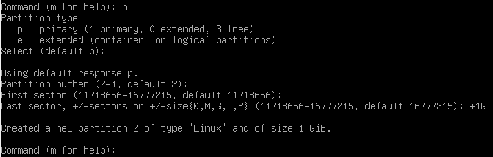 Commande n pour créer une nouvelle partition, puis p pour primaire et le numéro de la partition. Numéro 2 dans ce cas.