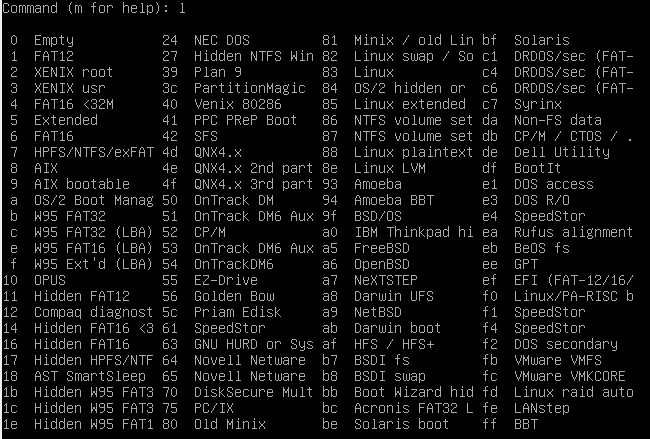 Pour connaître les différents types de partitions et leurs codes associés, il faut utiliser la commande l.