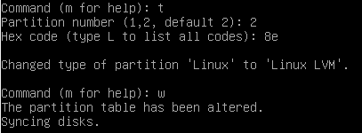 Le type de partition LVM a pour code 8e. Prenez le temps de bien vérifier que ce code soit bien le même pour vous car sur une autre de mes installations il était à 31.